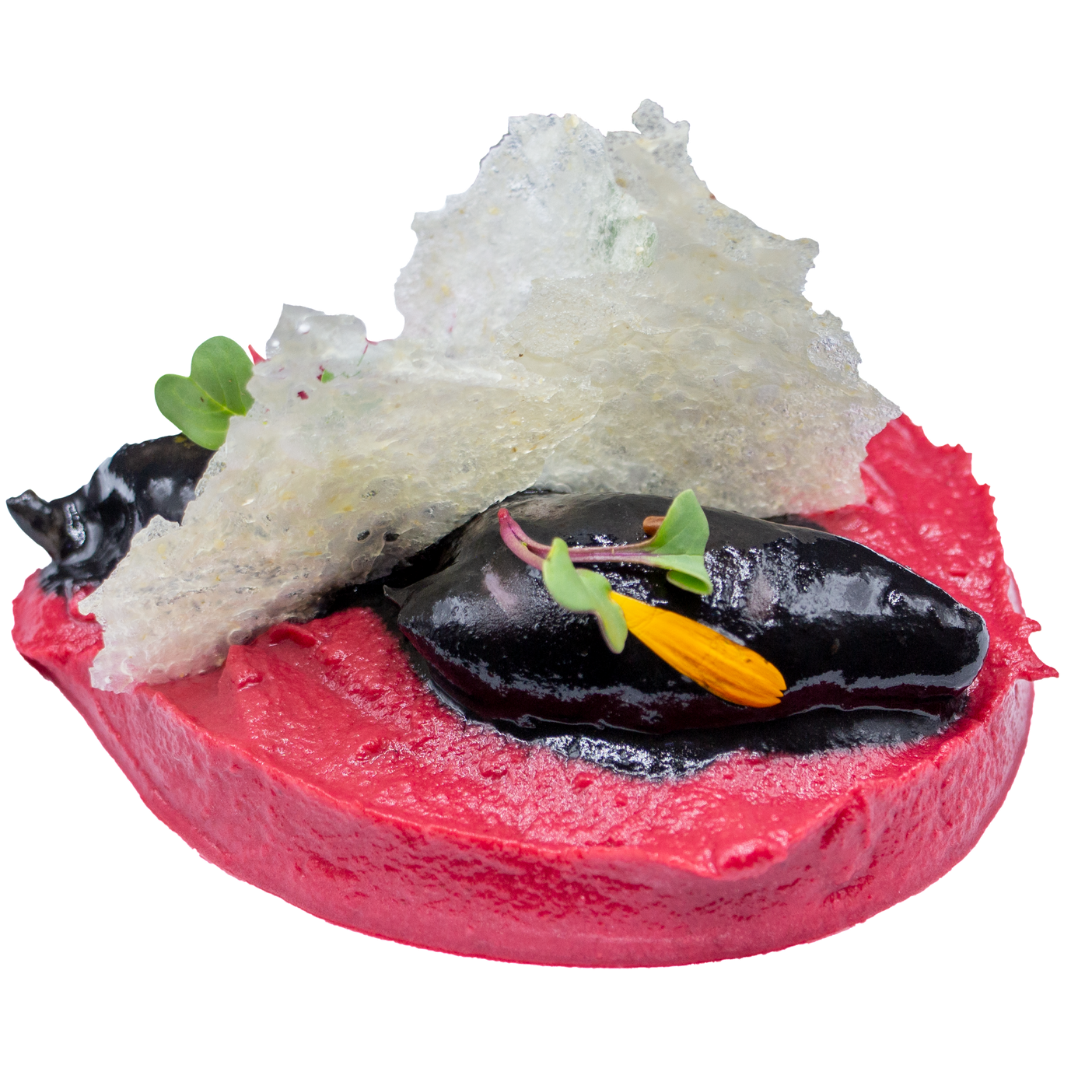 Humus de remolacha con chipirones en su tinta y crujiente de arroz. SIN GLÚTEN NI LACTOSA