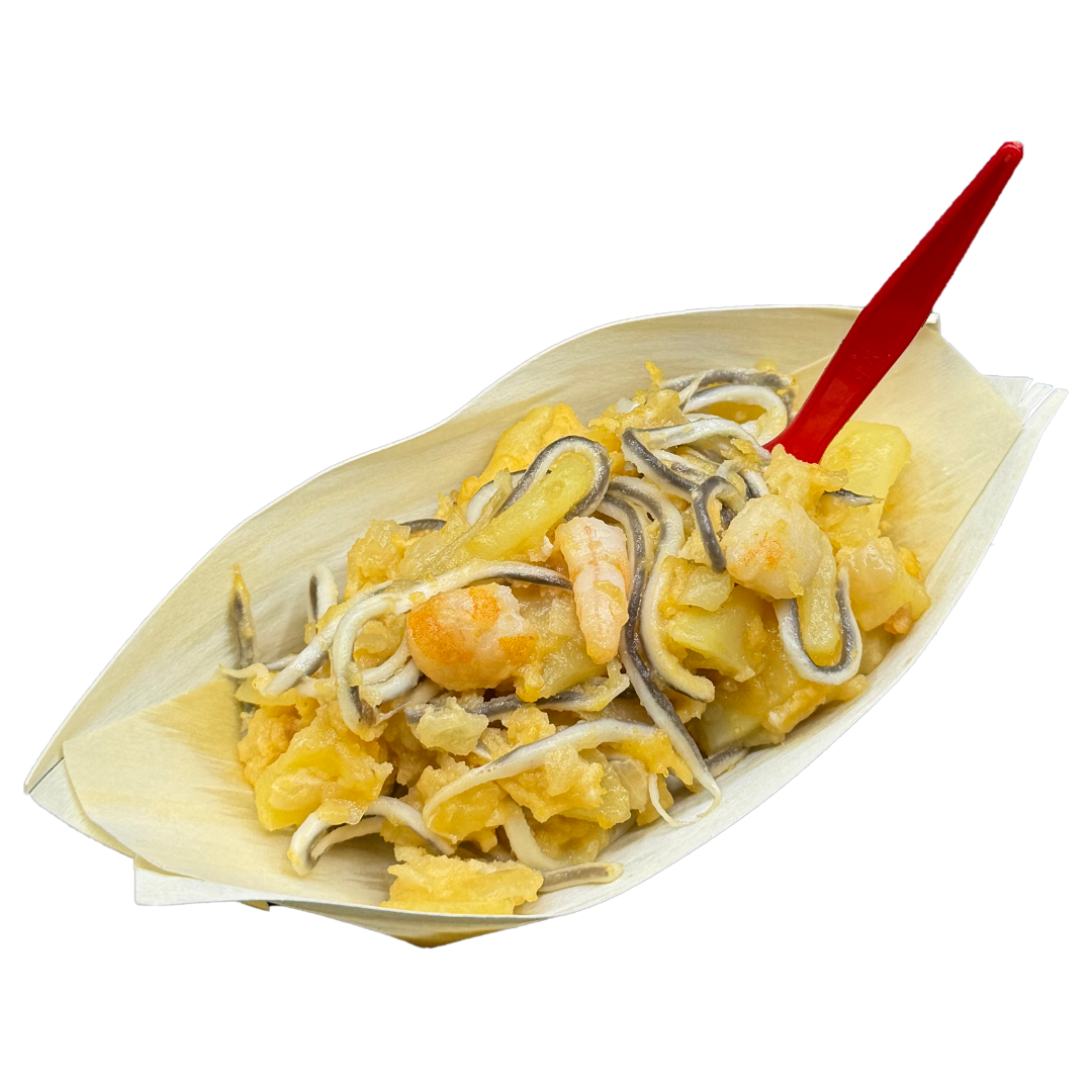 Patatas, cebolla, gulas, gambas y huevo