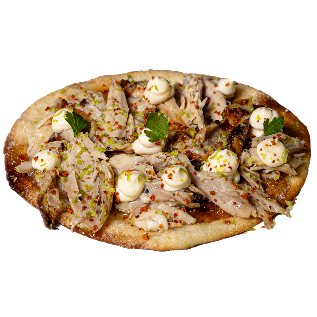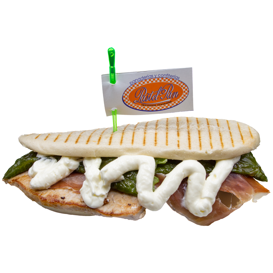 Pan de masa fina con cinta de lomo, jamón serrano, pimiento y alioli