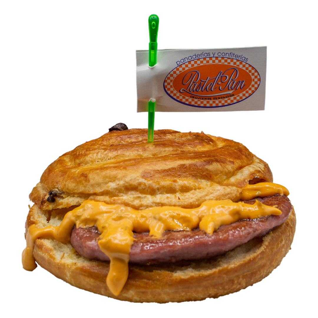 Hamburguesa de cerdo con salsa burger acompañada de un sneken (masa laminada de hojaldre típica de repostería danesa) con crema y pasas