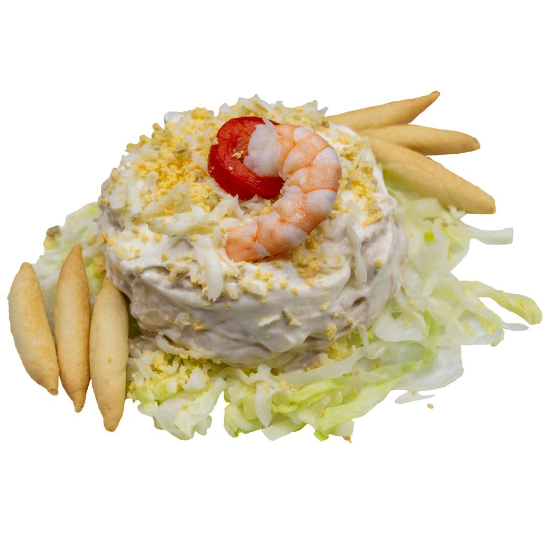 Patata cocida, mayonesa, lechuga, langostino, pimiento, atún, huevo