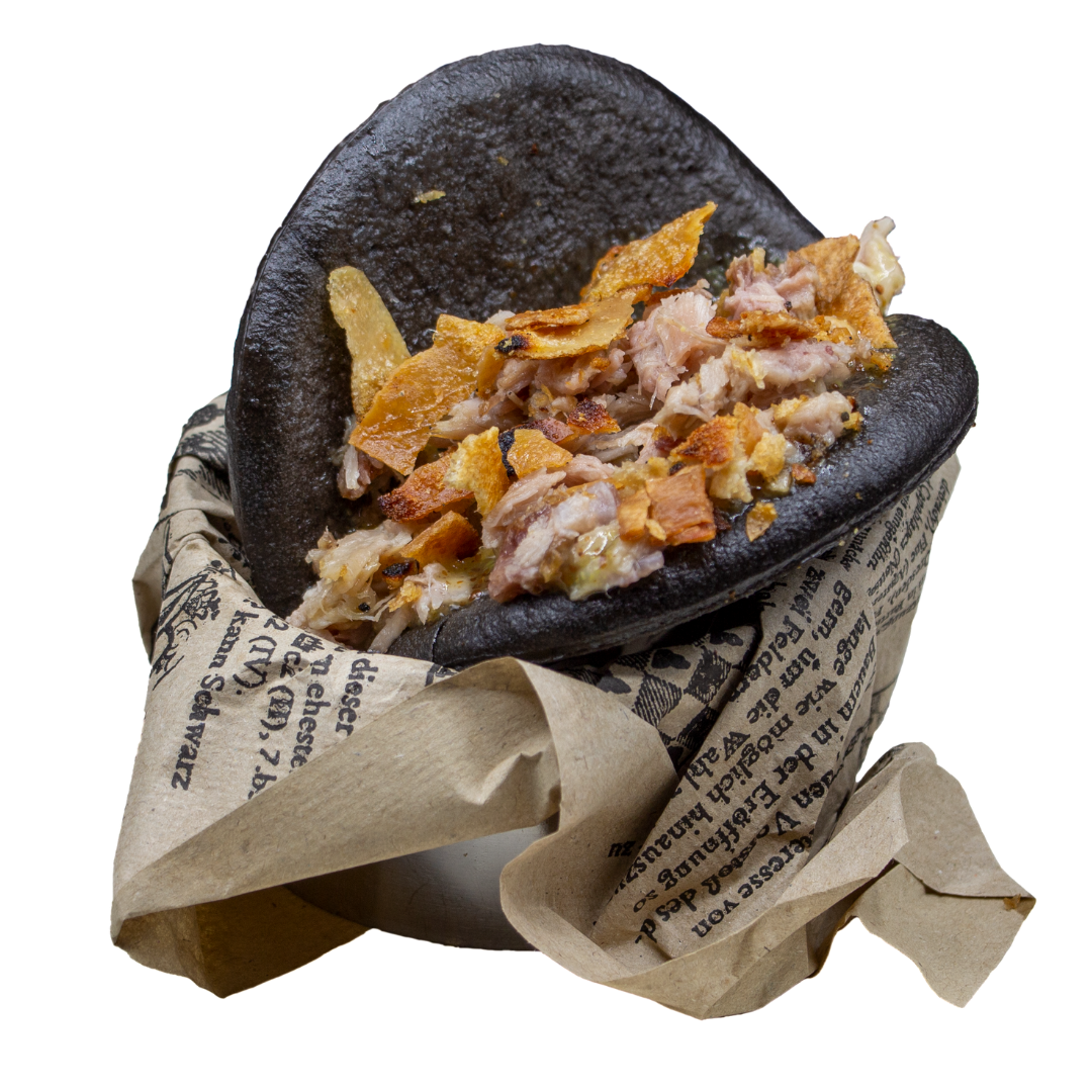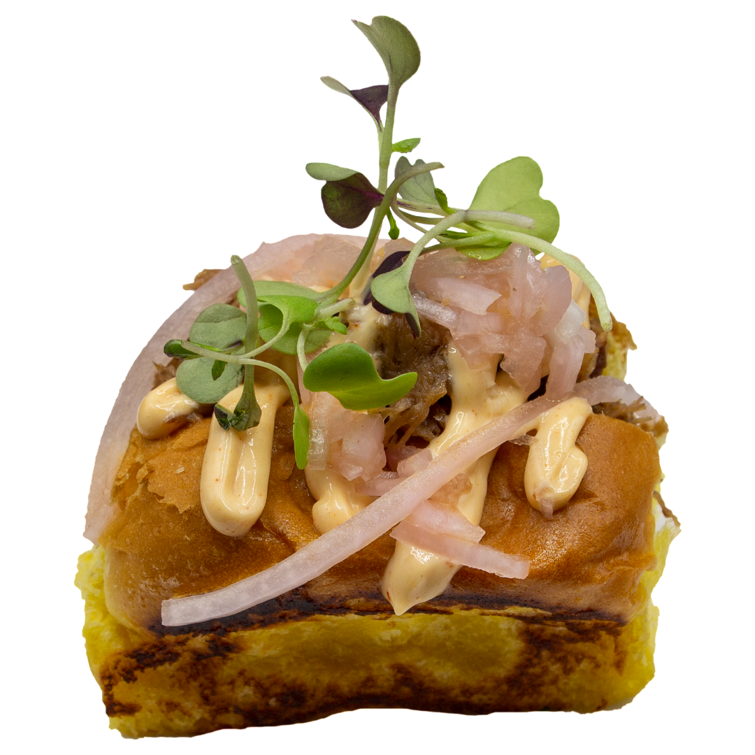 Pan bao, cochinillo asado con su piel crujiente y salsa a escoger «mostaza y miel, agriculce y teriyaki»