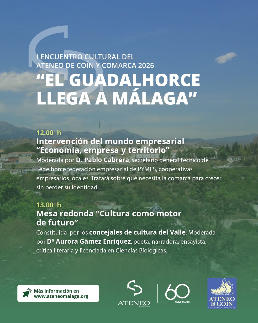 El próximo 14 de marzo de 2026, el Ateneo de Málaga acogerá una jornada dedicada al Valle del Guadalhorce como espacio de actividad económica, identidad cultural y proyección territorial.